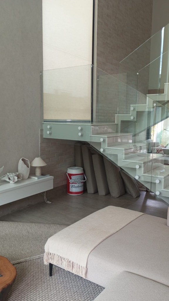Guarda-corpo em vidro temperado com fixação em botão inox – Projeto residencial de alto padrão.