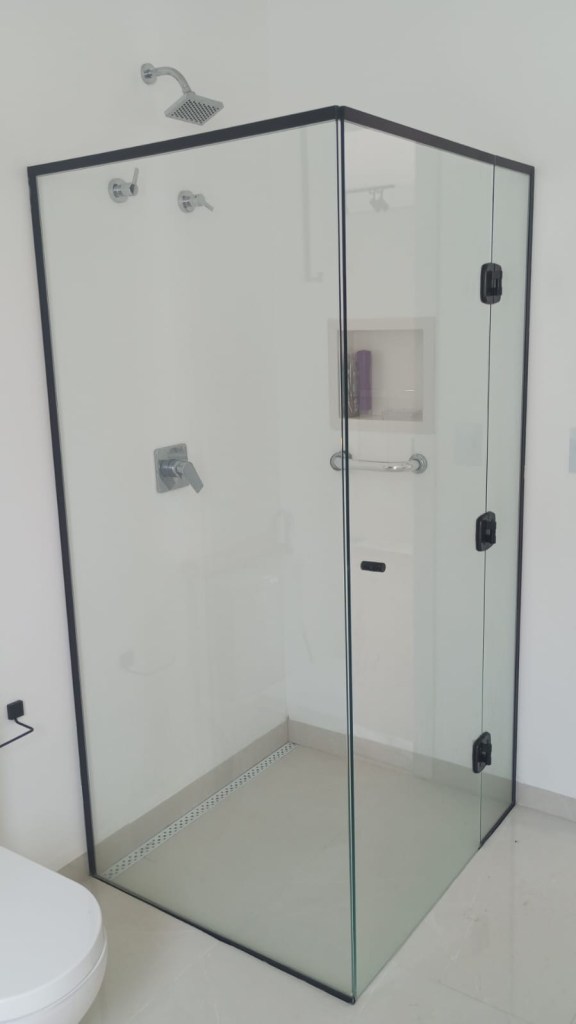 Box em vidro temperado com perfil preto e ferragens premium – Projeto moderno com acabamento minimalista e alta durabilidade.